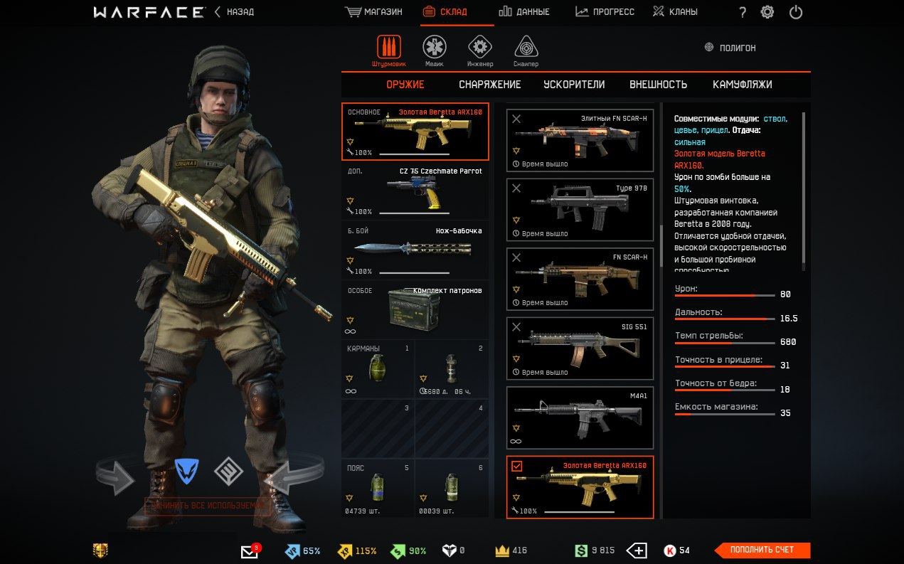 Warface - с. Альфа, 1 Золото, 11 Донов; Kriss Super V Custom, Золотая Beretta ARX160