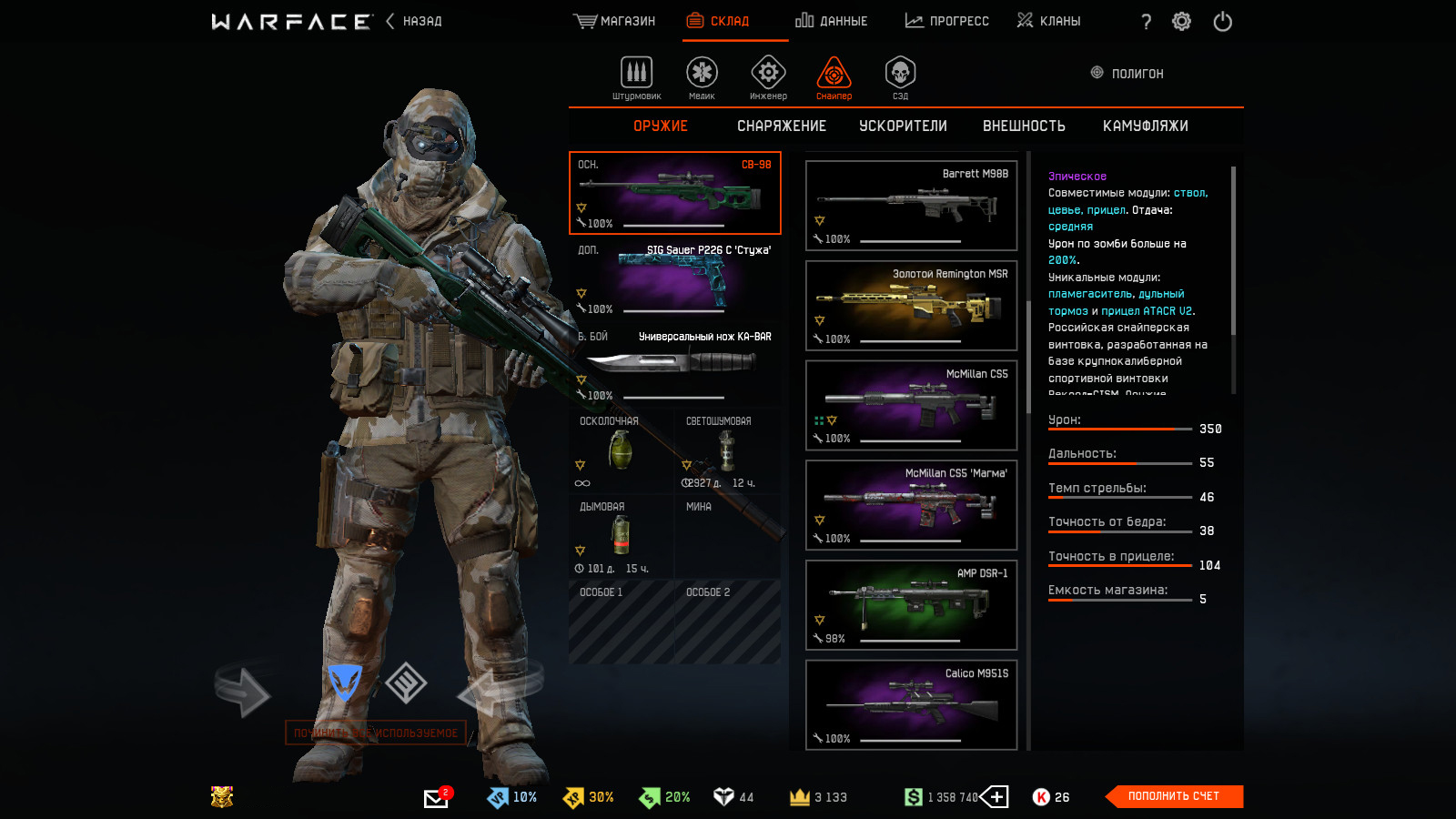 На снайпера: Calico M951S, McMillan CS5, McMillan CS5 «Магма», СВ-98, Золотой Remington MSR, Barrett M98B