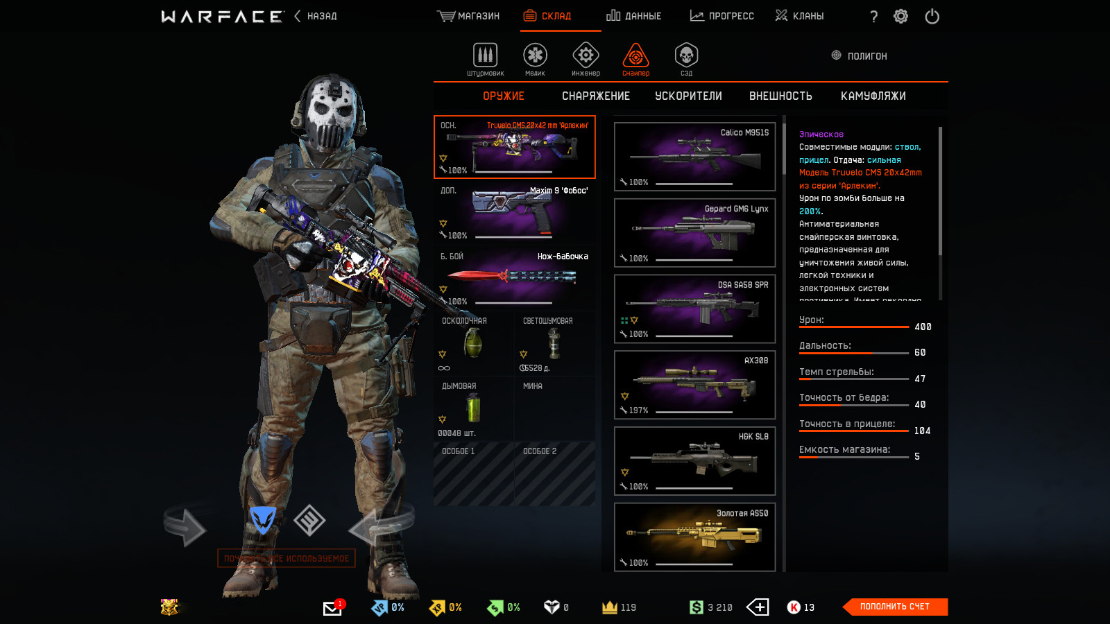 На снайпера: CDX-MC Kraken, AX308, Calico M951S, Золотая AS50, DSA SA58 SPR, Truvelo CMS 20x42 mm «Арлекин»